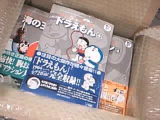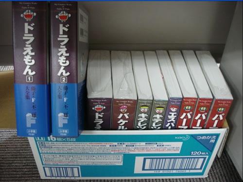 みなさんは、これが大好き!むしろヲタですが何か?という趣味はありますか?!*´-ω・)? 私は小さい頃からドラえもんが大好きです☆ ドラえもんが好きになったきっかけは、いとこのお兄ちゃんがドラえもん大好きで、マンガを全巻持っていたんですが、私が家に遊びに行く度に、そのドラえもんを読んでいたら、全巻を私にくれたのです! それから毎日のように、もらったマンガを読むようになったのがきっかけです☆大好きすぎて、ベッドの枕元に全巻並べて寝てましたねぇ~。 そのドラえもんも、もともといとこから譲り受けたものですし、毎日のように読んでいたので、結構ボロボロなんです...(;´Д`) しかも、実家に置いてあるので今は読みたくても読めない...(つд`) そんな私にとって夢のようなアイテムが数ヶ月前発売されたのです! その名もずばり!藤子・F・不二雄全集!! この全集は、ドラえもんはもちろん、藤子作品で既に絶版になってしまい、今じゃ本屋で手に入らないものも読めるという代物なのです!w((´∀`))wワオ!! しかも、単行本に収録されていないドラえもんも全て読めるという、ドラえもんヲタの私にとってはすばらしい全集なのです!! 全部で33巻になる全集なんですが、一気に発売されるわけではなく1ヶ月に3巻ぐらいずつ発売され、毎月家に届きます。 すでに前から届いている本がこちら。 あとまだ「おばけのQ太郎」と「エスパー魔美」も数巻ありますがこの入れてる箱に入りきらないので別に置いてありますw しかも普通の単行本よりサイズが大きい...。新しい本棚を買うまでしばらくはこの箱ですね(;´Д`A こちらが最近届いた本☆